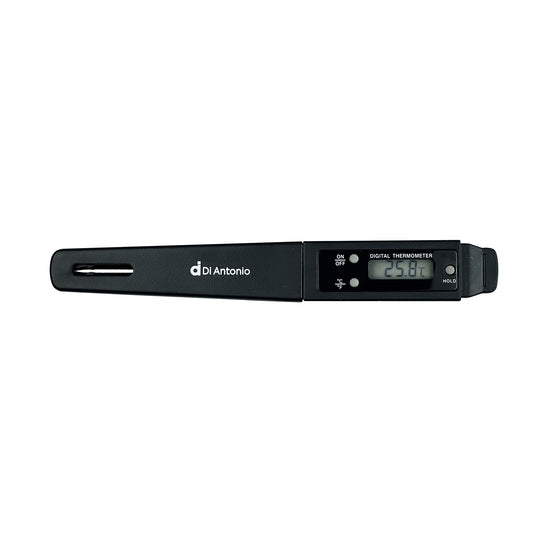 - Precision electronic probe thermometer measures hot or cold food